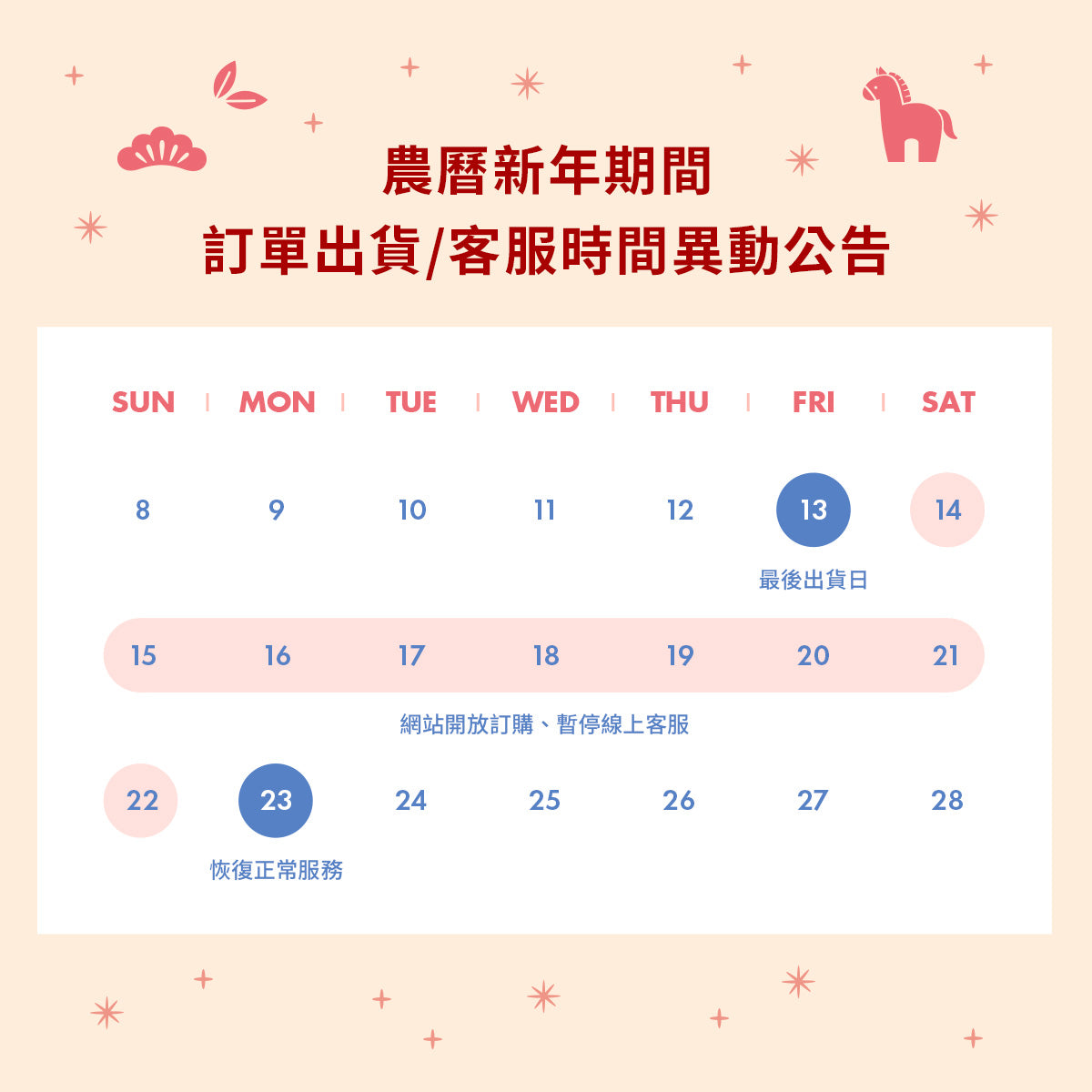 即日起下訂之訂單,因訂單處理需1-3個工作天及PANTOS-EMS寄送需5-6個工作天,故可能於農曆新年假期後到貨假期期間網站仍開放下訂,收件資訊務必填寫全英文資料,其他事項請參考公告